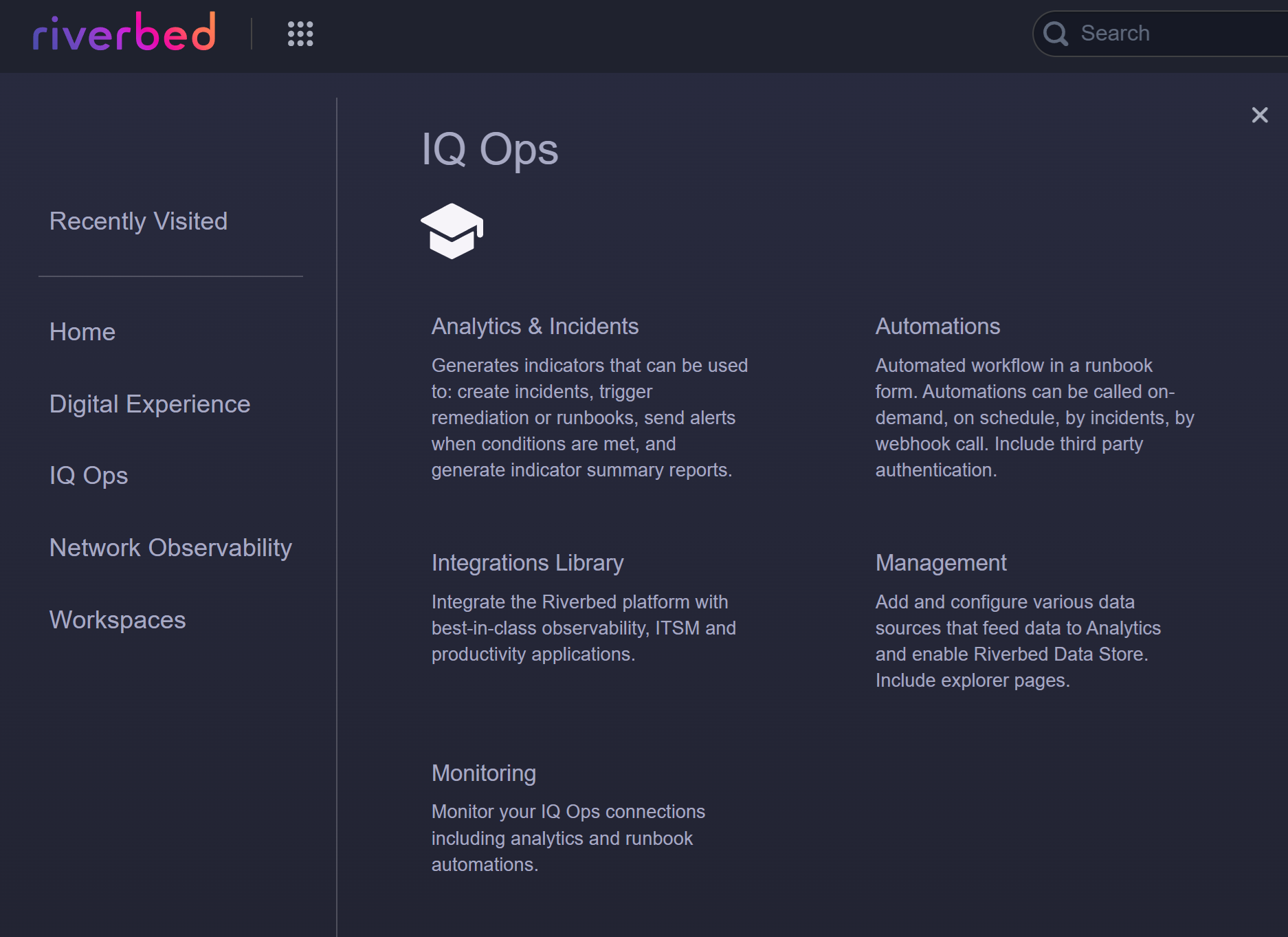 This menu gives you access to Riverbed IQ Ops: analytics that observe your environment, detect