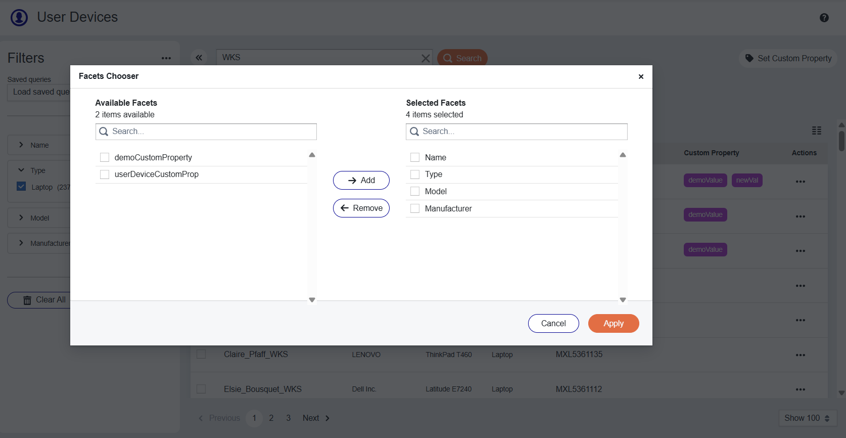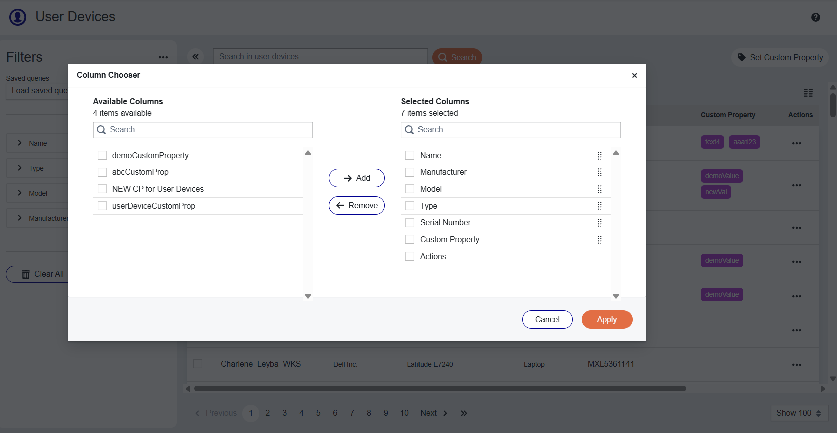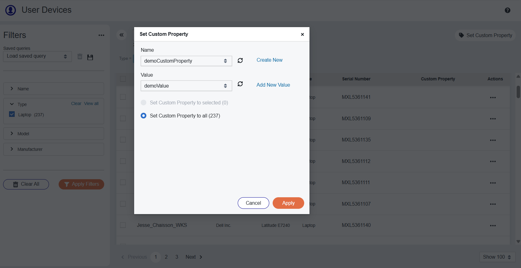 This action launches the Set Custom Property dialog. In the Name dropdown, select the custom property you want to use to tag the user devices. In the Value dropdown, select the value of the custom property. You can choose to apply the custom property to only the user devices currently selected in the table or you can apply the custom property to all the user devices in the current search results using the radio buttons. When you are done, click Apply.