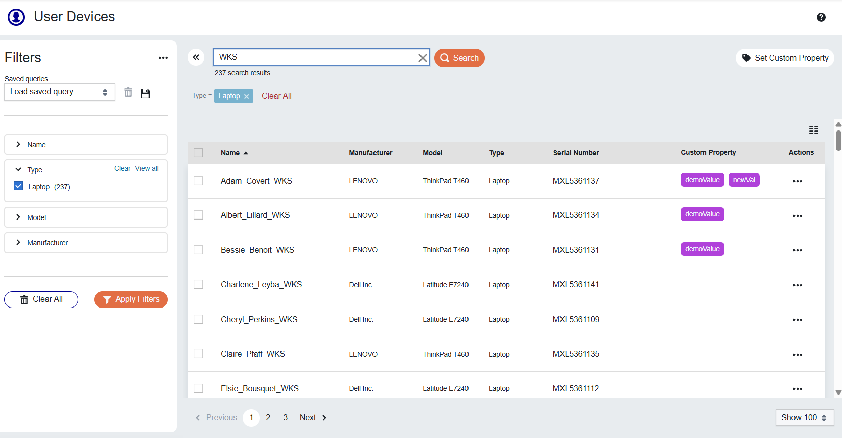 You can assign Custom Properties to a user device. You can use these custom properties as filters when you search for user devices. The custom properties can be displayed in the runbook tables. To set a custom property on a user device, click the Set Custom Property button in the toolbar.