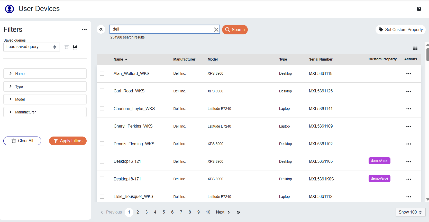 There are a large number of user device properties that can be used for filtering the user devices. To add a filter, expand the filter section and select the items you want to see in the search results and click Apply Filters.