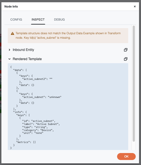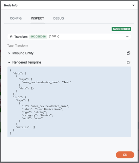 The Transform node provides a specialized Inspect tab that organizes transform debug data into structured sections. This enhanced debug view displays transform input/output data with automatic validation of the rendered Liquid template against the expected output data format.