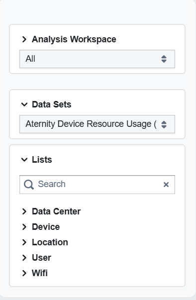 The sidebar can list one or more analysis workspaces. Each workspace groups data sets and group bys by use case. Examples include: